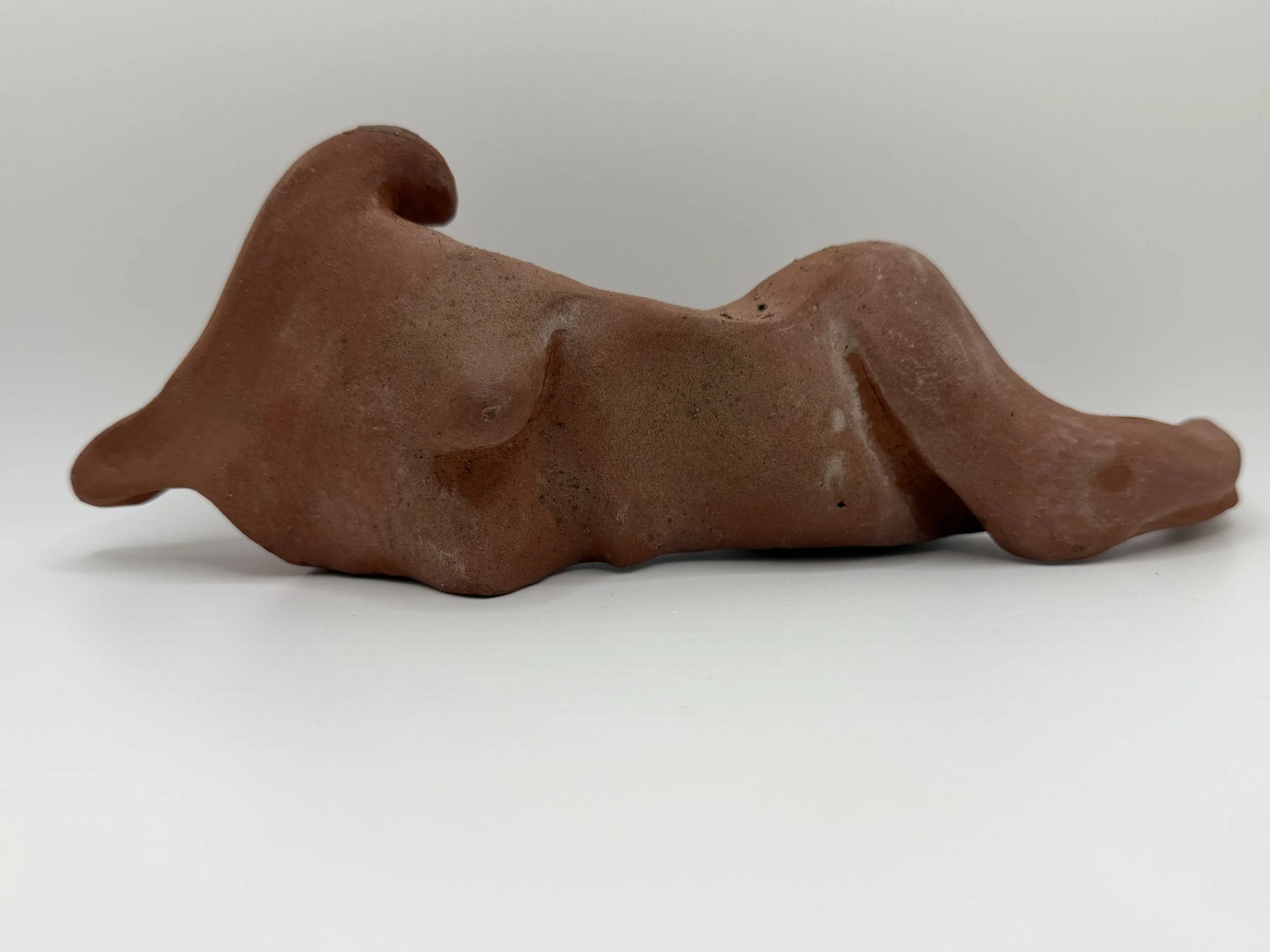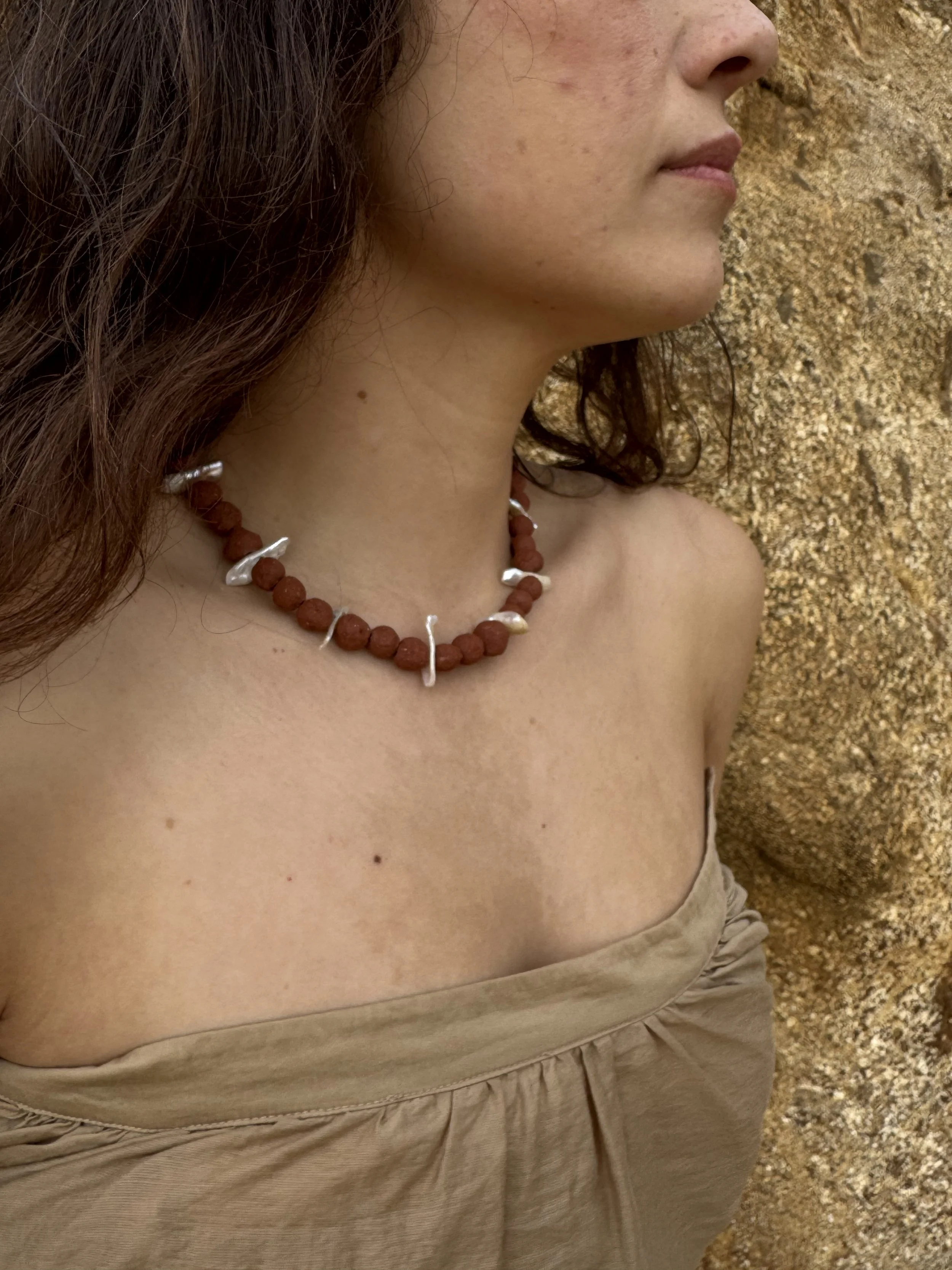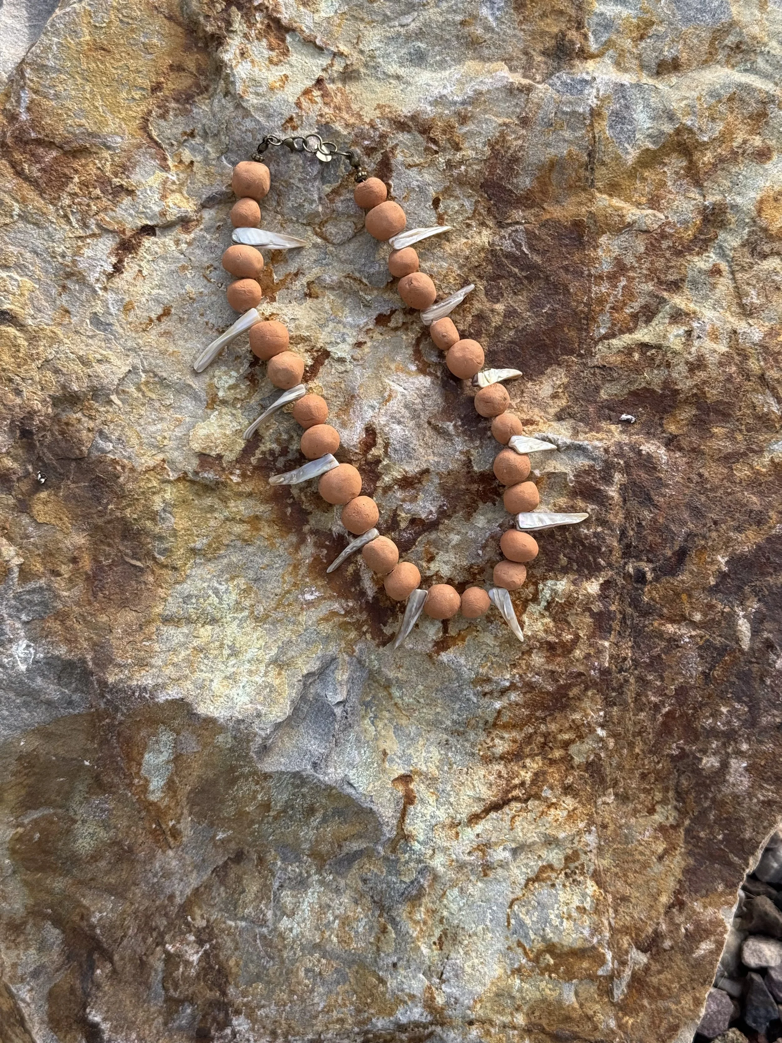 Each piece is made by hand from materials gathered and chosen slowly. Red clay, upcycled metal, natural stones.
